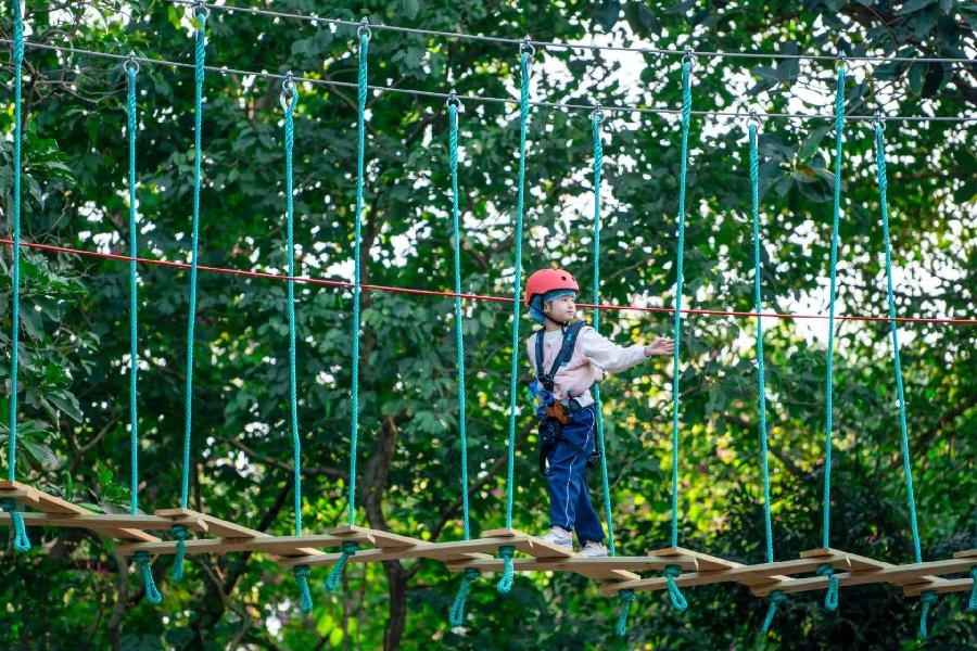体验者可获得户外丛林飞跃的基本原理,掌握相关的物理知识,如重力、摩擦力、动能与势能的转换。“这种运动有利于锻炼小朋友的平衡能力,在享受阳光、新鲜空气的同时,锻炼体能和胆量,家长也可以陪同一起‘飞跃’。”园区有关负责人介绍道,该项目所有安全带线路生产厂家为设计建造全球156座森林探险主题乐园经验的法国XTREM AVENTURES CONCEPT LTD丛林飞越集团,所有的设备、建材,小至一条绳索、一根木条,全部由法国、德国、意大利等欧盟原装进口,所有安装均由资深专业建设团队严格按照欧盟NF EN 15567-1标准完成,获得SGS认证。